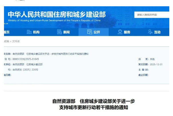 近日,中华人民共和国自然资源部与住房和城乡建设部联合印发《关于进一步支持城市更新行动若干措施的通知》(文件号:自然资发〔2025〕226号),标志着中国城市更新框架在制度层面的结构性巩固。
